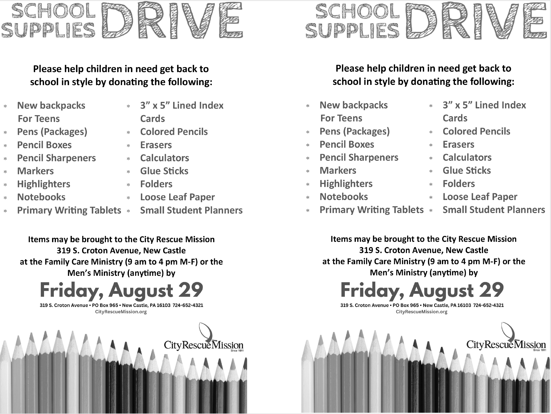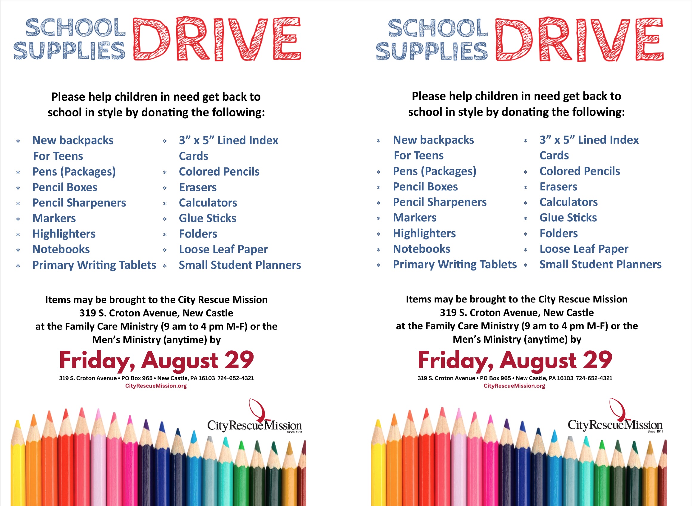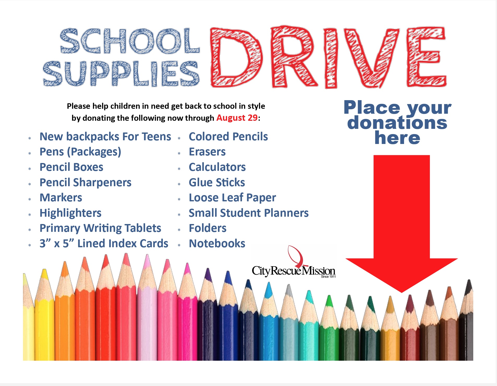 Donations for the School Supplies Drive may be brought to the Family Care Ministry (9 a.m. to 4 p.m. Monday through Friday)